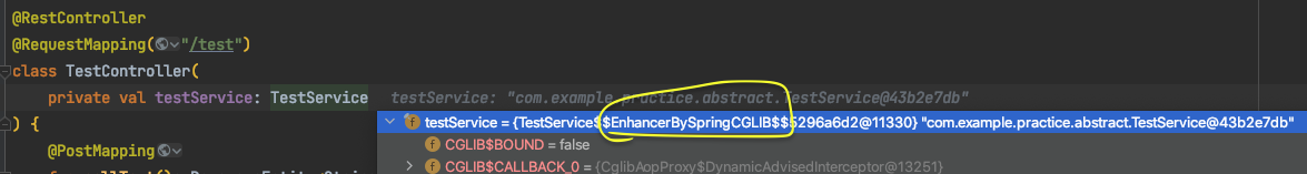 호출을 하면 아래 노랑색 동그라미 부분이 보이시나요? 바로 이게 프록시로 만들어졌다는 것인데요. CGLIB가 무슨 의미인지 뭐하는 건지 잘모르겠다면 다음 글에서 설명을 보시면 됩니다. 일단은 프록시를 주입받아구나! 하고 넘어가도 좋습니다.
