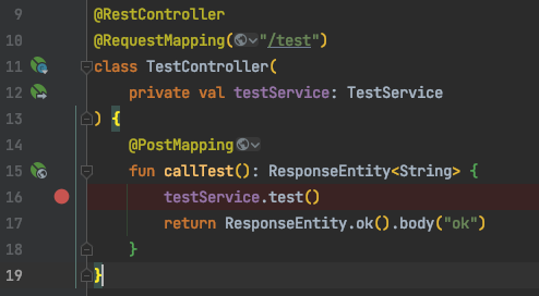 그리고는 아래와 같이 브레이크포인트를 걸고 디버그 모드로 애플리케이션을 실행시킨 뒤에 저희가 만든 엔드포인트를 호출해보도록 합시다.