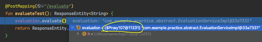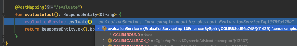 자 다시 애플리케이션을 실행시키고 똑같이 엔드포인트를 호출할건데 컨트롤러의 주입받는 부분을 수정해야 해서 아래처럼 다시 컨트롤러를 정의해주세요. 그리고 evaluate() 호출하는 부분에 아까처럼 브레이크포인트 한번만 걸어주세요~