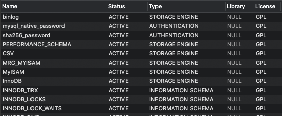 스토리지 엔진뿐만 아니라 모든 플러그인의 내용은 다음의 명령어로 확인할 수 있다.