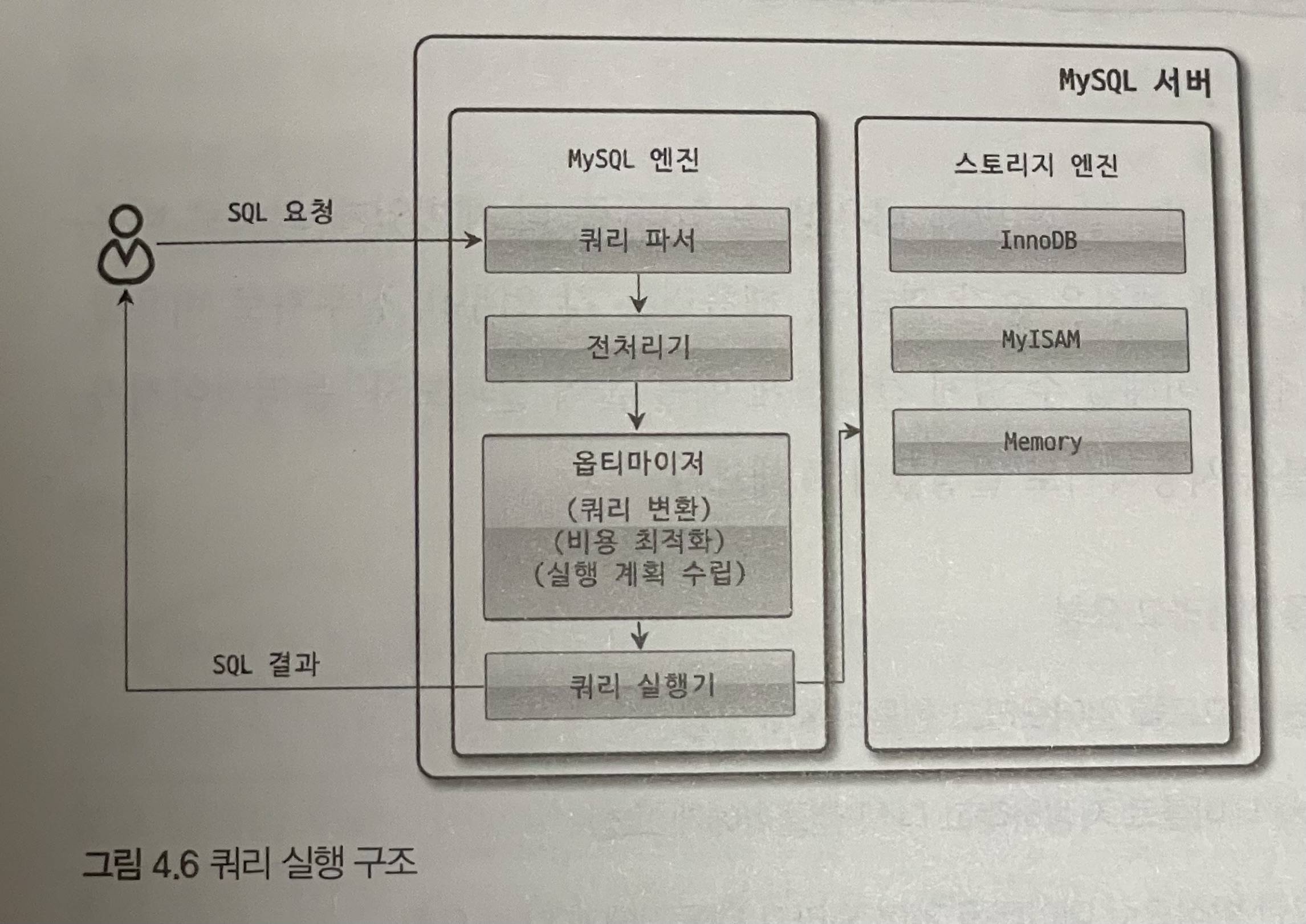 위의 이미지에서는 보이지 않지만 쿼리 파서 이전에 쿼리 캐시가 존재한다.