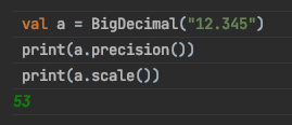 BigDecimal은 정수와 제곱을 이용하여 숫자를 표기합니다. 위에서 보았듯이 실수는 10진 실수를 2진 실수로 변환할 수 없는 경우가 생겨서 발생한 것이므로 BigDecimal은 이를 정수로 변환하여 다루는 걸로 보여요. BigDecimal에는 precision과 scale이 존재하는데 예를 들어 숫자가 12.345 가 저장되어 있다면 전체 숫자의 길이인 5가 precision 그리고 이중 소수점 밑에 자리 수인 3이 scale이 되는 것이죠.