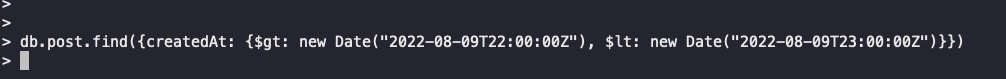 {createdAt: {$gt: new Date("2022-08-09T22:00:00.000Z"), $lt: new Date("2022-08-09T23:00:00.000Z")}}