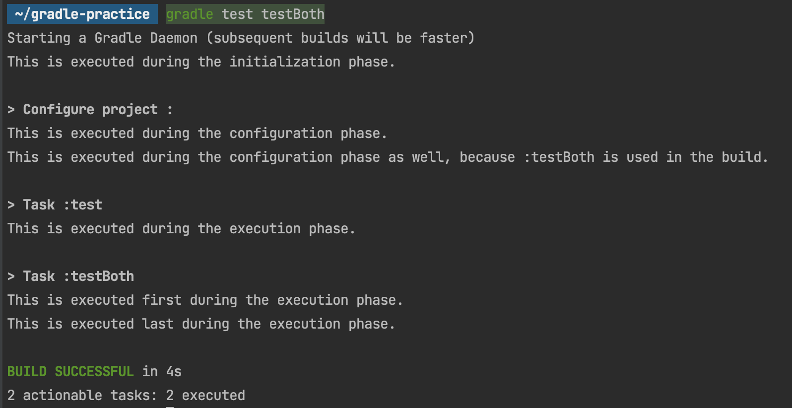 정의한 build.gradle 파일을 보면서 출력물을 이해해봅시다. 저희가 gradle 명령어로 넘긴 인자는 test, testBoth 태스크 이름입니다. 따라서 저의가 build.gradle에 정의한 태스크 중 test, testBoth가 대상이겠죠. 따라서 configured 태스크의 경우에는 실행이 되지 않는게 맞습니다. 따라서 아래 문구가 출력이 되지 않은 것이겠죠.