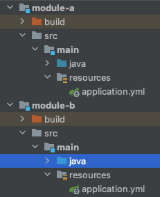 module-a의 프로퍼티 파일(/src/main/resources/application.yml)이 존재하고, module-b의 프로퍼티 파일이 존재합니다.