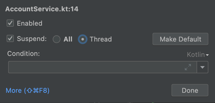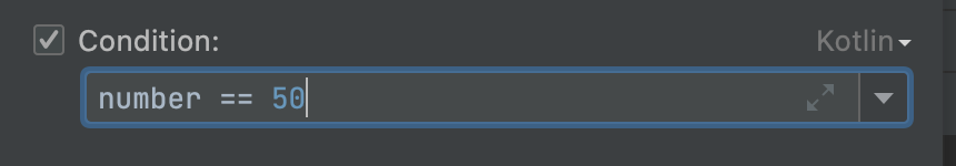 여기서 number가 55인 순간에 라인을 중지하고 싶다고 가정했을 때 브레이크포인트를 걸고 55가 될 때까지 F8 버튼을 누르기는 힘듭니다. 이 경우 디버깅 옵션의 Condition을 사용할 수 있습니다. 위와 같이 브레이크 포인트를 걸어서 우클릭으로 디버깅 옵션을 띄우면 아래에 Condition이라고 되어있는 부분이 존재할 겁니다. 이 부분에 코드를 삽입할 수 있는데 언어는 우측에서 선택하면 되고(저는 지금 화면과 같이 Kotlin으로 설정하였습니다) 아래의 텍스트 칸에는 아래 사진과 같이 해당 언어를 사용하여 조건을 걸 수 있습니다.