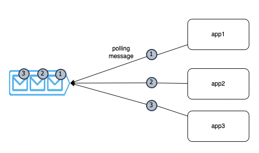 일단 생각했던 아키텍처를 그림으로 그려보면 아래와 같습니다. Queue에서 동시성 처리가 되어있다면 app1, app2, app3에서 동시에 요청하더라도 메시지1, 메시지2, 메시지3이 잘 분배가 되겠지라는 게 기본적으로 깔려있던 전제였습니다.
