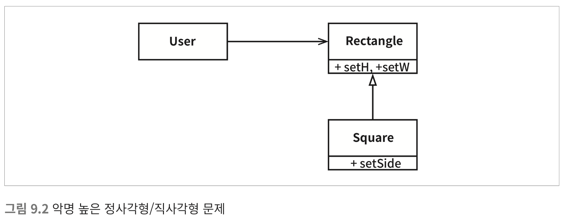 Square = 정사각형, Rectangle = 직사각형일 때 위는 LSP 원칙을 준수하지 못하고 있다. 특히 Square는 높이와 너비가 서로 독립적으로 변경될 수 없기 때문에 Rectangle 하위 타입으로는 적합하지 못하다. 책의 예시에서 이를 잘 보여주고 있다.