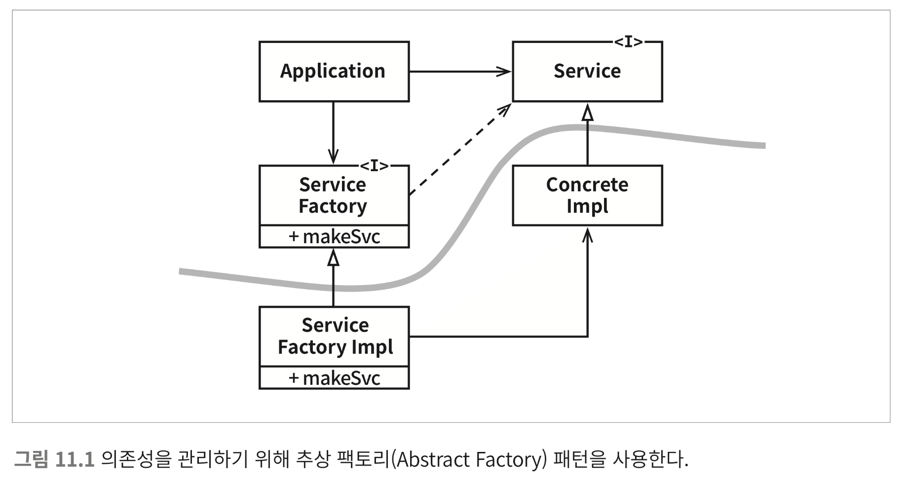 위는 추상 팩토리를 사용한 구조이다. Application은 Service 인터페이스를 통해 ConcreteImpl 인스턴스를 생성해야 한다. 그러나 얘기했듯이 객체를 생성하는 부분을 Application에서 하게 되면 소스 코드 의존성이 발생하기 때문에 Application은 ServiceFactory의 makeSvc를 이용하여 객체를 생성하도록 만들었다.