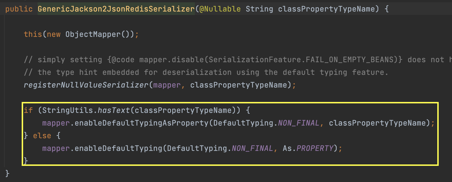 2.2.13.RELEASE 버전의 경우 GenericJaskson2JsonRedisSerializer 디폴트 설정이 아래처럼 되어있습니다. (모든 버전을 확인해보지는 않았고 2.7.5 버전에는 이 부분이 Everything으로 바뀌었습니다)