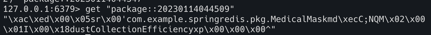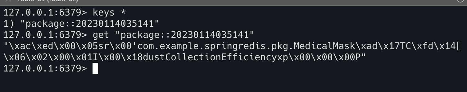 이제 redis에 들어가서 값이 어떤 식으로 저장이 되어있는지 보겠습니다. redis-cli에 들어가서 저장되어 있는 키를 전부 검색해 봅니다(로컬이라 무지성으로 그냥 keys * 로 검색하도록 하겠습니다.) 방금 전 발급받은 시리얼넘버로 캐시가 저장되어 있는 모습을 볼 수 있고 해당 value 값은 아래 사진과 같이 들어가 있습니다.