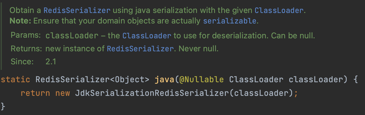 Redis의 디폴트 설정값을 사용하지 않고 GenericJaskson2JsonRedisSerializer을 이용하는 방법도 있습니다. 디폴트 설정을 사용하지 않는다면 Serializable도 계속 붙여줄 필요도 없습니다. GenericJaskson2JsonRedisSerializer는 Object를 내부의 ObjectMapper를 사용하여 json 형태로 저장하고, 꺼내올 때는 json을 ObjectMapper를 이용하여 Object 형태로 만들어주는 클래스입니다.