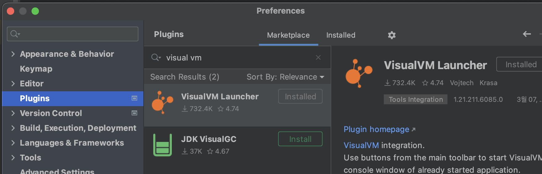 Plugins 탭에서 Visual VM 검색을 하고 아래 플러그인을 설치해 줍니다.