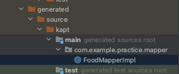 이렇게 인터페이스로 정의된 FoodMapper는 그레이들이 빌드하면서 kapt를 이용하여 Implement 클래스를 만들어주게 되는 건가 보네요. 따라서 빌드를 돌린 이 후에 build/generated 폴더로 들어가 보면 생성된 코드가 보입니다.