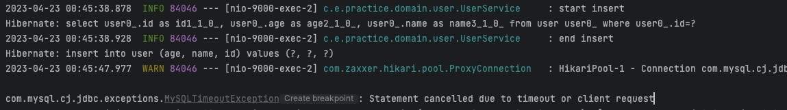 위처럼 프로퍼티를 통해 타임아웃 설정을 하니 적용이 된 것을 볼 수 있었습니다.