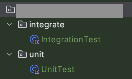 IntegrationTest를 integrate이라는 패키지를 생성해서 해당 패키지 안으로 이동시키고, UnitTest를 unit이라는 패키지 안으로 이동시킵니다. 그럼 이런 모습이 될 것 같습니다.