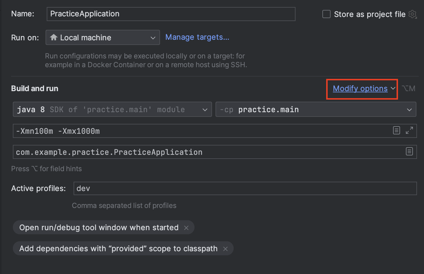 이 값들은 Intellij IDEA의 실행 설정에 넣어줄 수 있습니다. 아래 화면처럼 Edit Configurations에 들어갑니다. 그리고 Modify options에서 Add VM Option을 선택해 줍니다. 후에 사진과 같이 "-Xmn100m -Xmx1000m" 옵션을 넣어주면 됩니다.