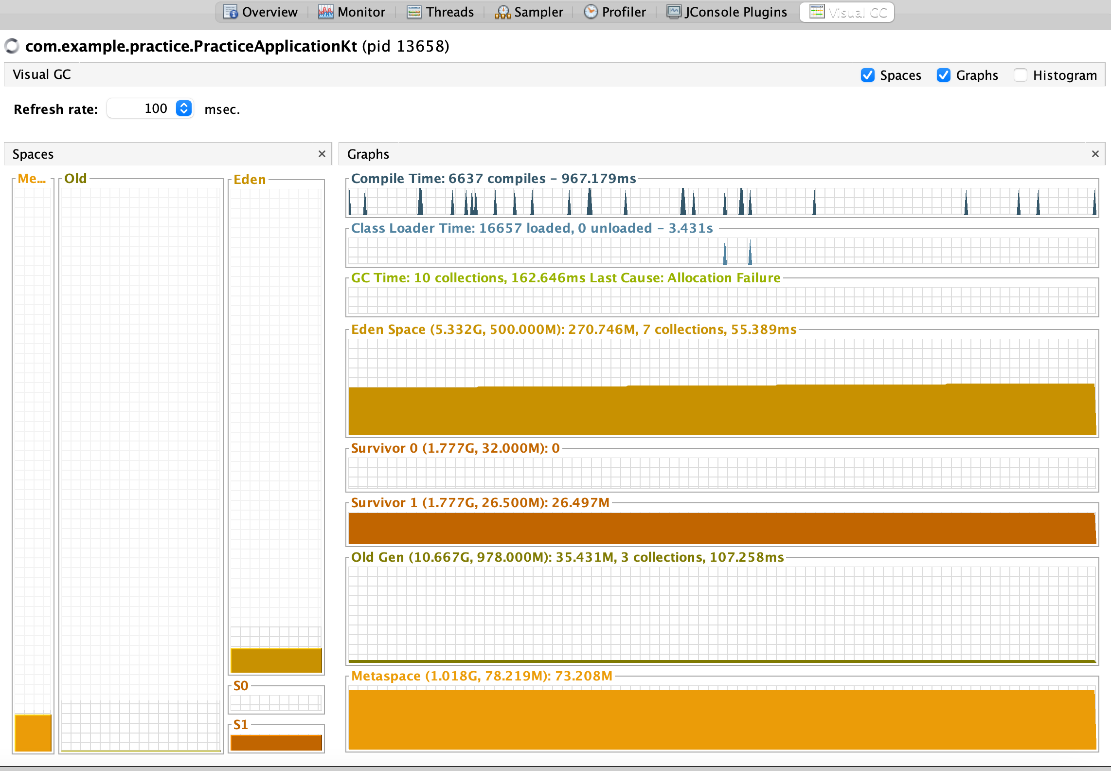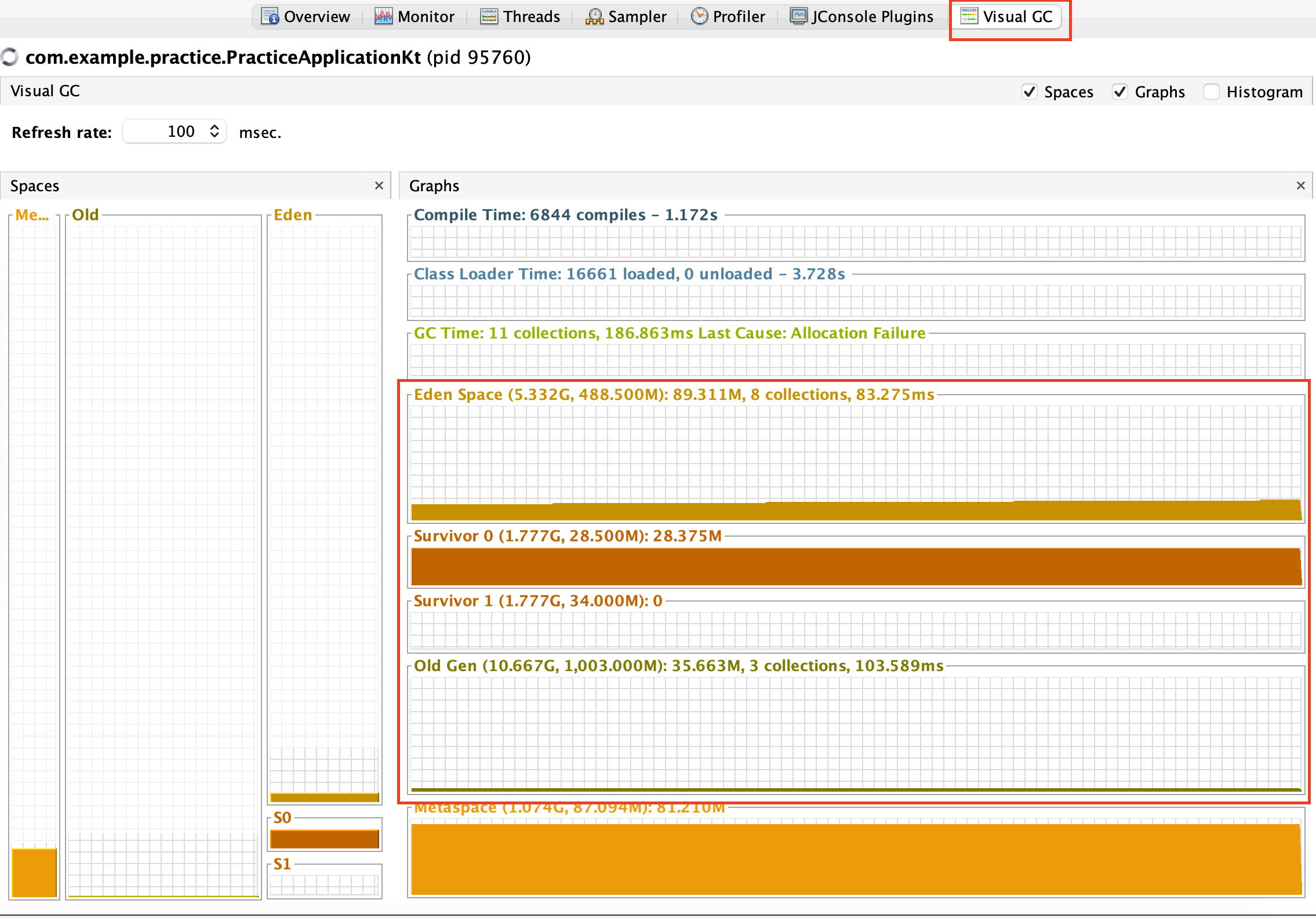 실행하고 나서 좌측에서 현재 실행 중인 애플리케이션을 선택한 후 우측에서 아까 위에서 설치한 "Visual GC" 탭으로 이동해 주세요.