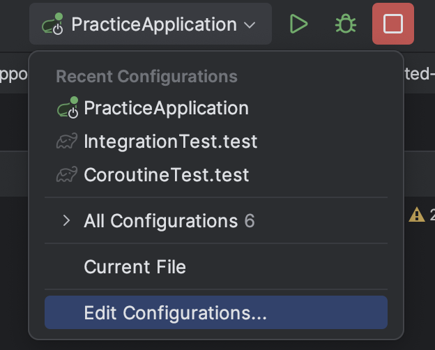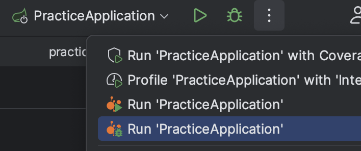 애플리케이션을 바로 실행해 보겠습니다. Intellij IDEA에서 애플리케이션을 실행할 때 VisualVM 아이콘이 있는 걸로 실행해 주세요.