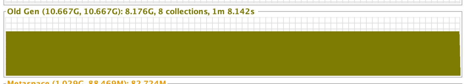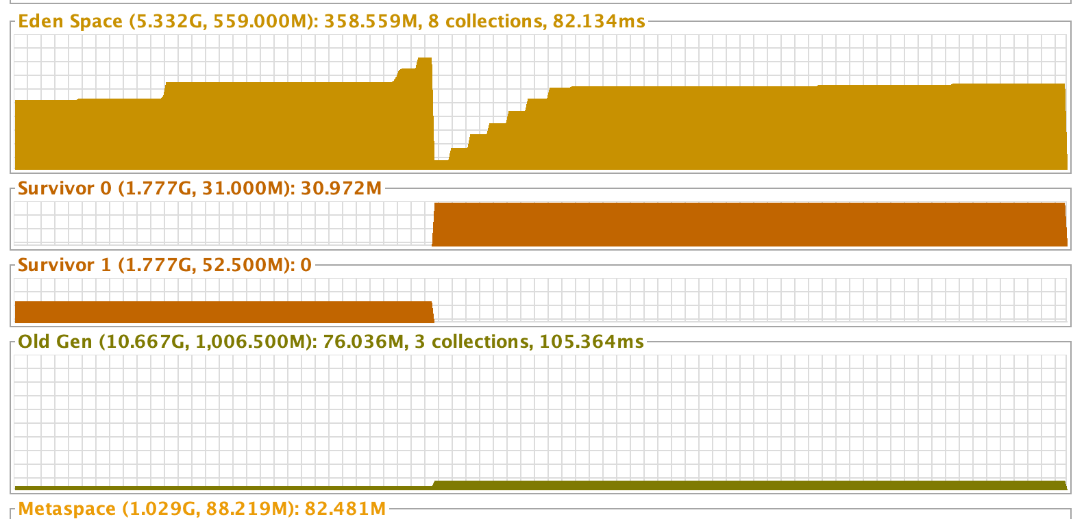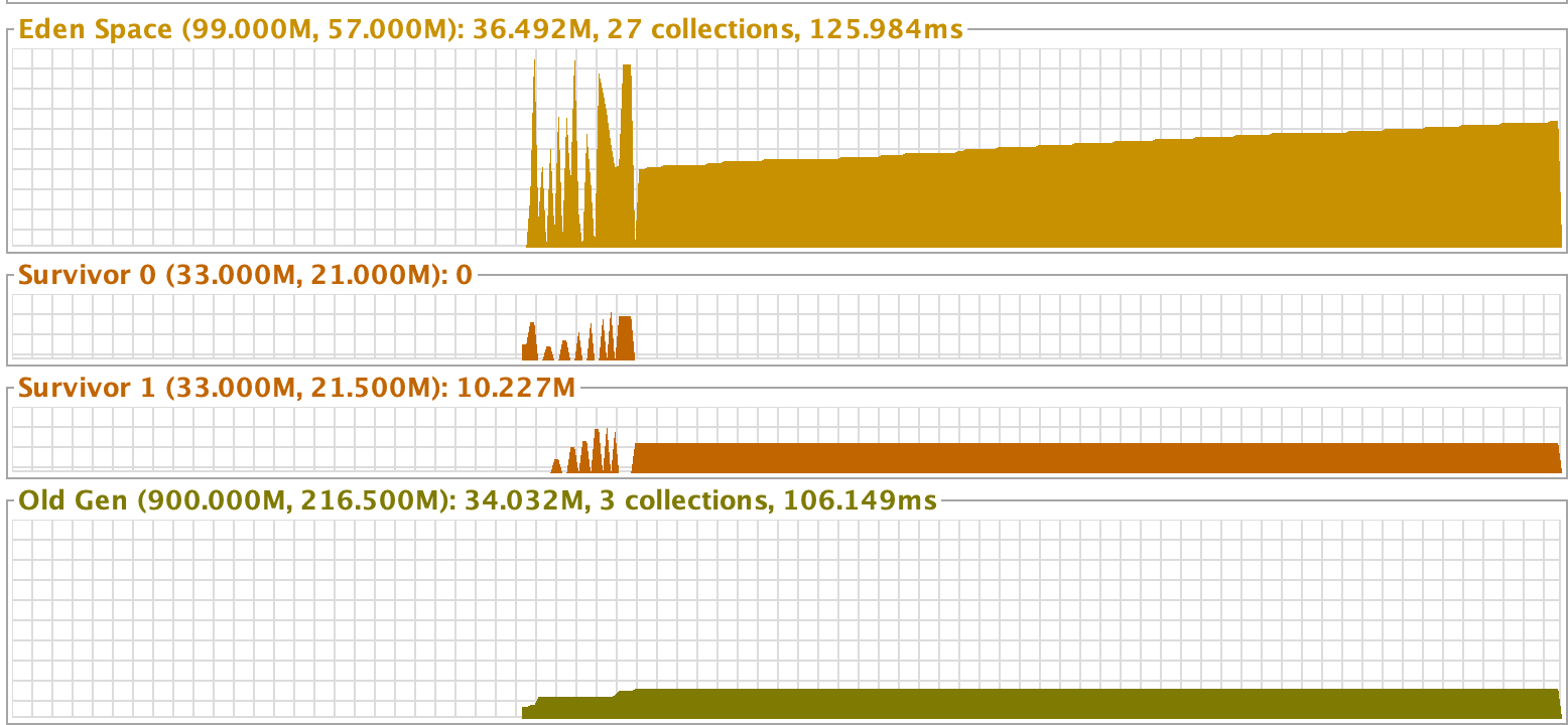 100만 개의 문자열을 쌓고나니 Eden Space 그래프에서 뚝 떨어지는 구간을 확인할 수 있는데 이는 minor gc가 동작했기 때문일겁니다. minor gc가 동작했음에도 100만개의 문자열은 여전히 참조 중이기에 Old Gen 영역으로 이동이 된 모습입니다.