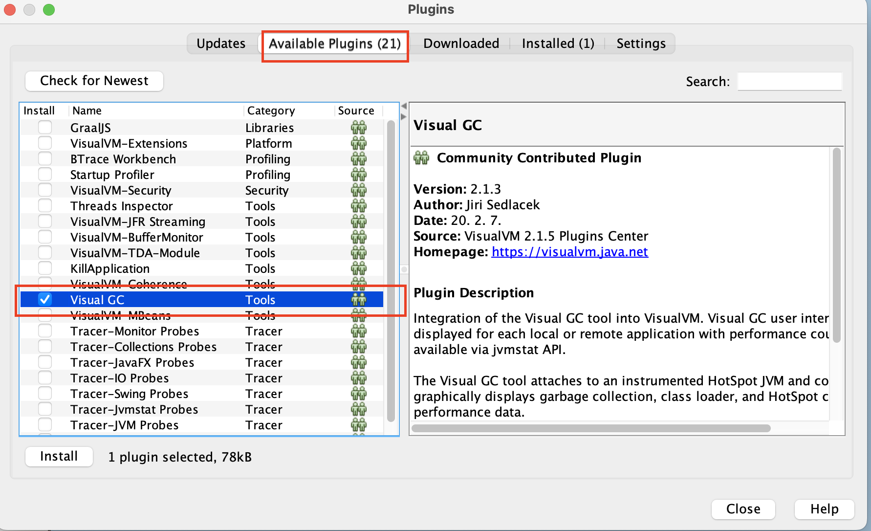 이후에 아래 사진과 같이 Available Plugins 탭에 들어가서 Visual GC라는 플러그인을 설치해 주세요.