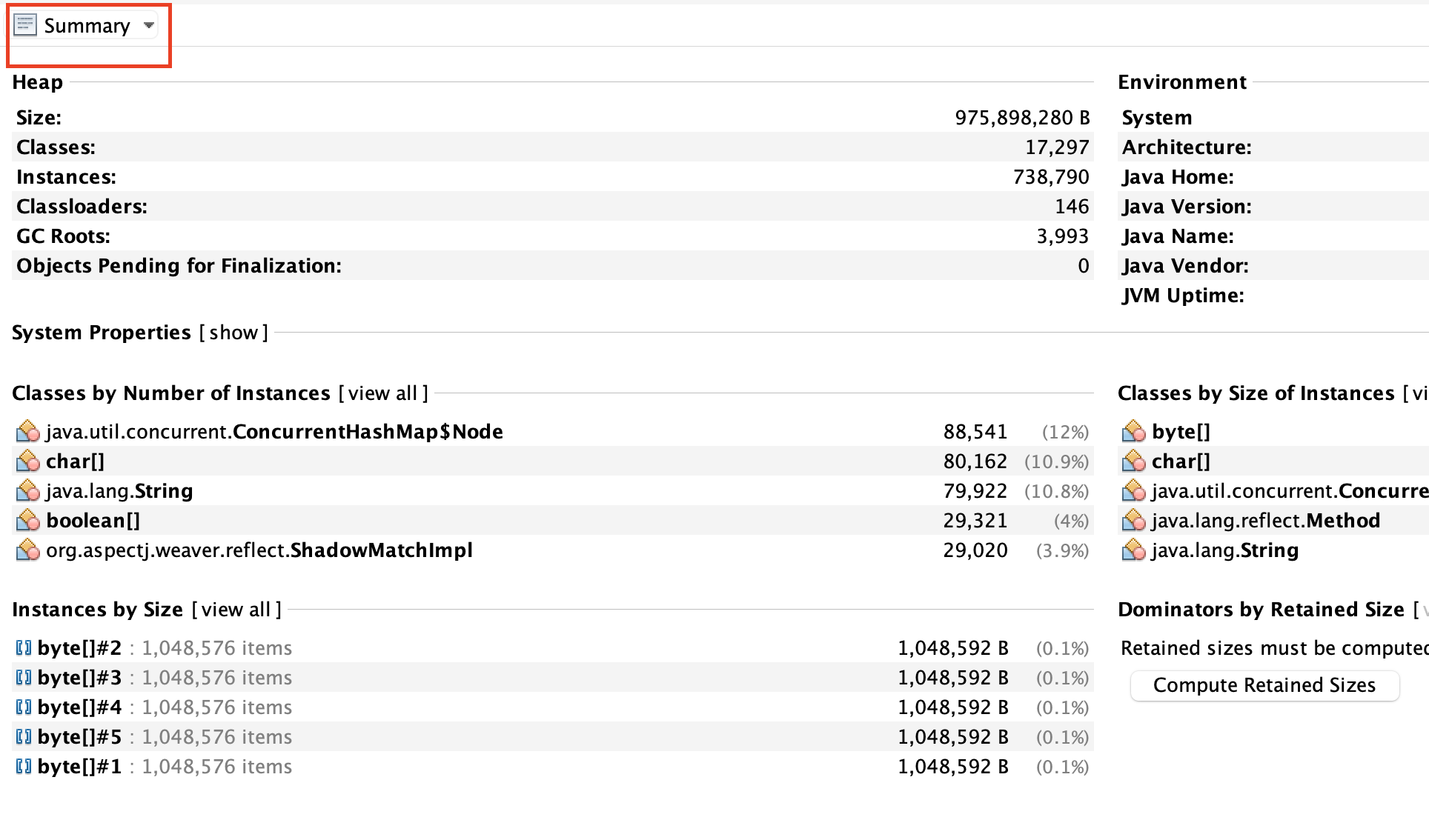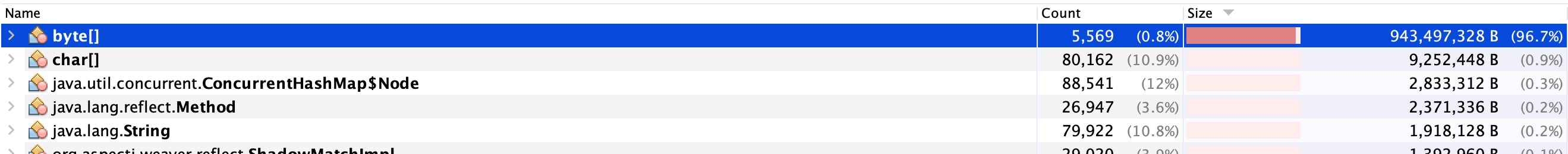 아래화면처럼 현재 객체 중에 size를 가장 많이 차지하고 있는 순으로 정렬을 한번 시켜주면 byte[] 배열이 현재 메모리의 97퍼센트 정도를 차지하고 있음을 볼 수 있습니다.