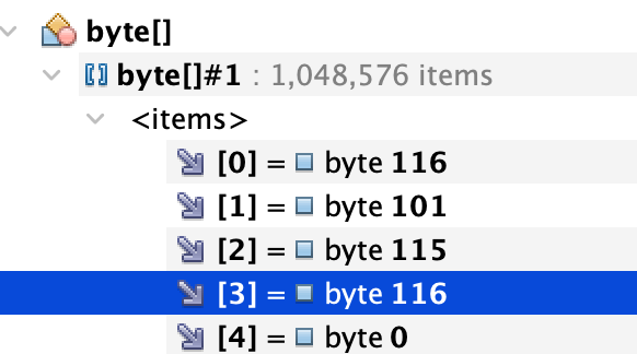 좀 더 상세히 보기 위해 byte[] 이름 옆에 있는 화살표를 클릭해서 열어주면 아래 사진처럼 저희 생성한 'test ' 배열이 보임을 알 수 있습니다.