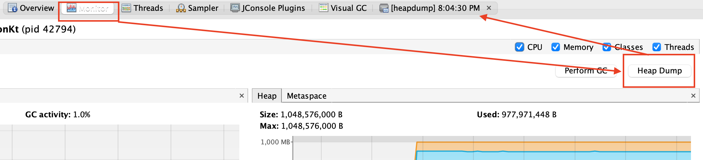 이렇게 메모리가 가득 찬 상태에서 힙 덤프를 한번 떠보겠습니다. Monitor 탭에 들어가서 우측에 있는 Heap Dump 버튼을 눌러줍니다. 그러면 사진과 같이 "[heapdump] 덤프 시간 "라는 탭이 하나 만들어질 텐데 들어가 줍니다.