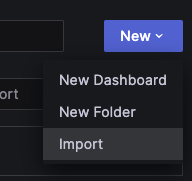 이제 다시 그라파나 페이지로 이동합니다. 좌측 메뉴바에서 Dashboards 페이지로 접속합니다. 우측의 New 드롭다운 메뉴에서 Import를 클릭합니다.