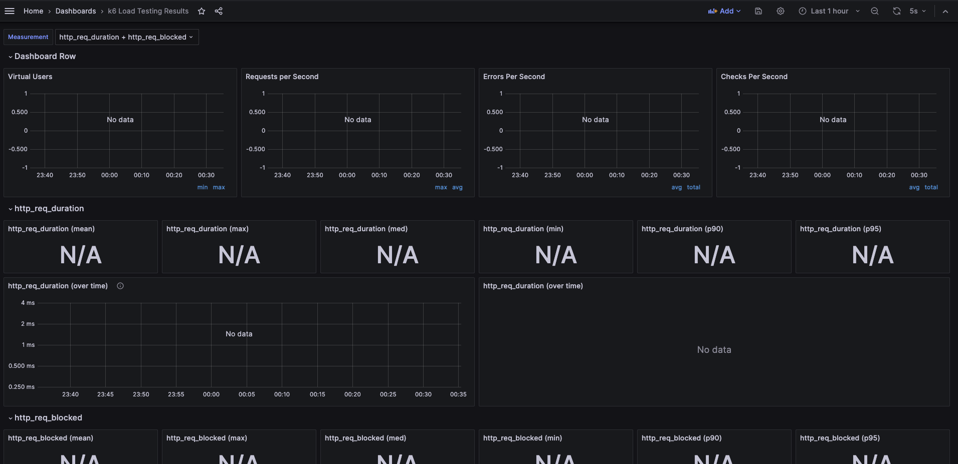 그 이후 Import via grafana.com 텍스트 입력칸에 저희가 아까 복사했던 대시보드 ID를 입력하고 Load 시켜줍니다. 그러면 아래와 같이 화면이 나올 텐데 k6는 아까 저희가 연결했던 influxdb를 선택하고 import 시킵니다. 이제 대시보드가 만들어졌습니다. 아직 influxdb에 쌓아놓은 데이터가 없어서 초기에는 아래처럼 그래프가 텅텅 비어있을 겁니다.