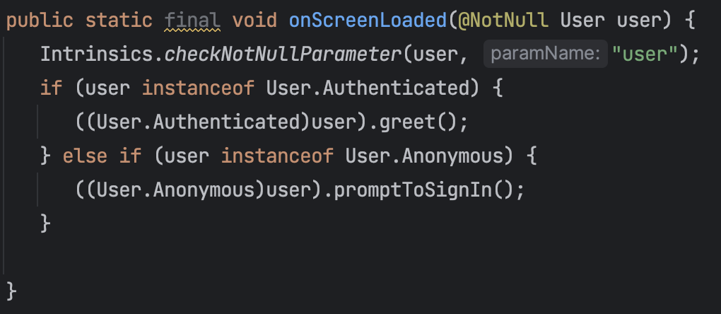 변환된 자바 코드의 onScreenLoaded 부분을 보면 타입 체크 이후 강제 형변환을 해주고 있는데, 이 형변환은 코틀린 컴파일러가 만들어준겁니다.