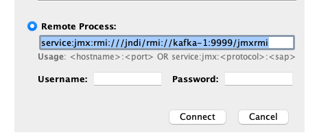 jconsole이 실행되었다면 접속 정보를 입력해주면 되는데 주의할 점은 hostname입니다. 원래 기본값은 localhost인데 저의 경우 도커컴포즈 환경 + jmx expoter 같은 추가적인 세팅을 하다 보니 문제가 좀 있어서 `java.rmi.server.hostname`을 kafka-1로 설정해 주었습니다. 그래서 로컬 hosts 파일에 kafka-1 -> localhost로 등록해주어야 했습니다. 해당 프로퍼티를 사용하지 않은 분이라면 그냥 localhost로 접속시도하면 됩니다.